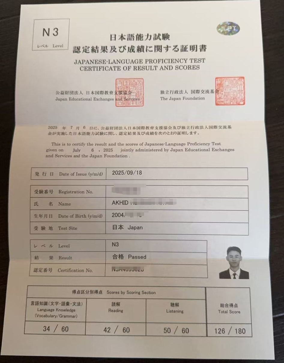 このたび、日本語能力試験(JLPT)において、弊組合の実習生が多数合格いたしました。